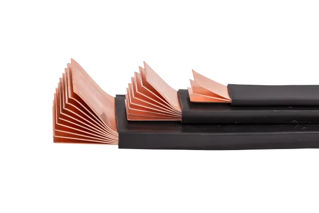 Гибкая шина состоит из медных полос толщиной 0,8...1 мм в оболочке из специального ПВХ-пластиката. Гибкие шины имеют широкую номенклатуру типоразмеров — как правило от 20×2 до 120×10, где первая цифра указывает на ширину медной пластины, а вторая — количество медных пластин толщиной 1 мм в пакете. Гибкие изолированные шины, как правило, используют для подключения электрических аппаратов к распределительным шинам, но с их помощью можно выполнить и любые другие виды электрических соединений, например, подключить шинопровод к трансформатору по стороне 0,4 кВ. При подключении НКУ к шинопроводам и трансформаторам гибкую шину используют также для компенсации процессов теплового расширения и защиты от вибрации.