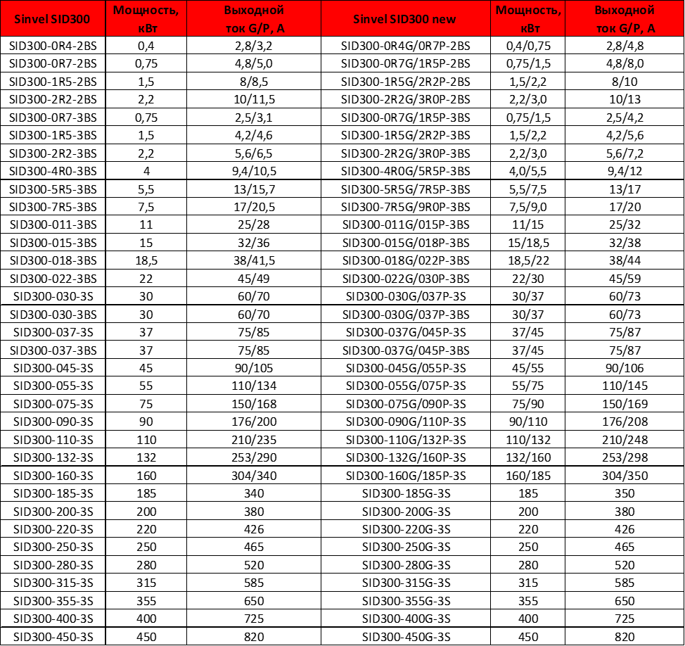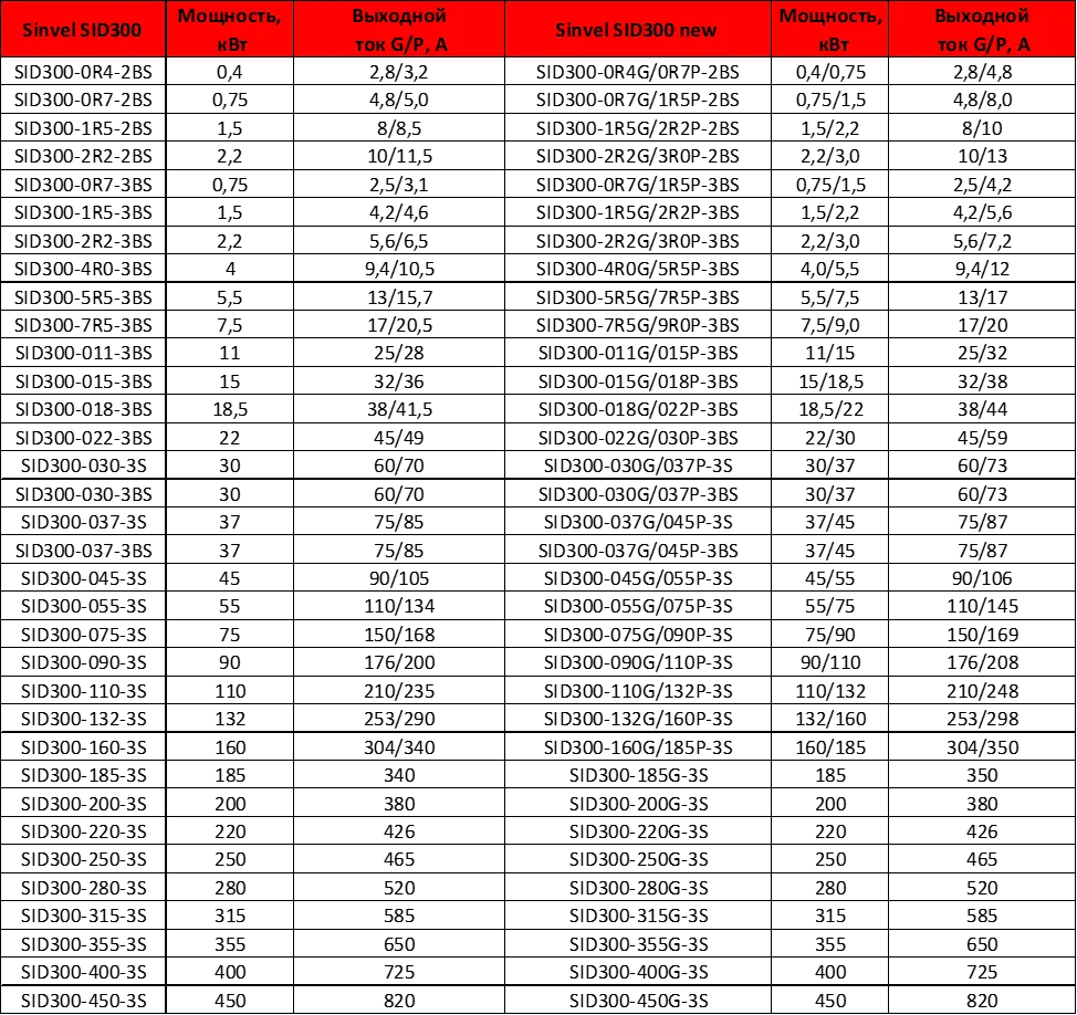 Обновлённый Sinvel SID300 до 185кВт в отличие от предшественника теперь поддерживает два режима работы по перегрузочной способности: G (150% в течение минуты) и P (120% в течение минуты).