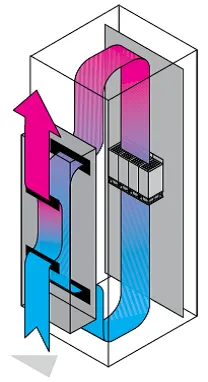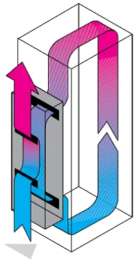 Теплообменники воздух/воздух Теплообменник обдувается с обеих сторон двумя вентиляторами: внутри оболочки – потоком теплого воздуха, снаружи – потоком холодного. Потоки разделены герметичной перегородкой, благодаря чему в шкаф не проникают пыль и влага. Теплый внутренний воздух охлаждается через стенки теплообменника более холодным наружным воздухом. Поскольку поток тепла всегда происходит в сторону уменьшения температуры, то подобные теплообменники могут применяться только если наружная температура ниже внутренней не менее чем на 5 °С. |