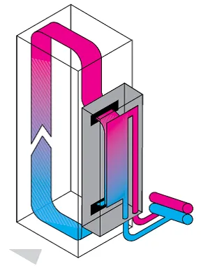 Теплообменники воздух/вода Теплообменники «воздух/вода» работают аналогично теплообменникам «воздух/воздух», только вместо холодного наружного воздуха используется холодная вода из внешнего водяного контура. Благодаря использованию холодной воды или другого теплоносителя можно отвести такое количество тепла, что температура внутри оболочки станет ниже чем температуры снаружи. |