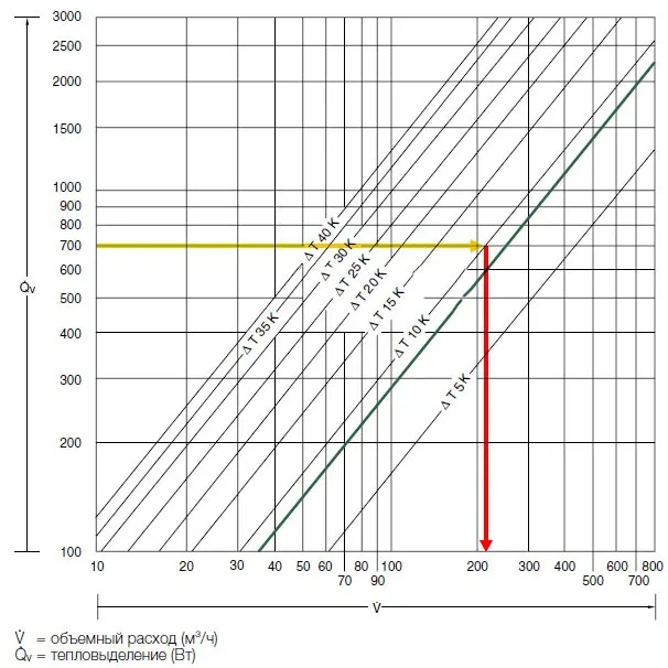 Ограничения — краткий расчет не учитывает способность шкафа рассеивать тепло без вентилятора. Это не критично если внутри стоит оборудование с большим тепловыделением, например - частотный преобразователь. Упрощение не занижает требуемый воздушный поток вентилятора, поэтому приемлемо.