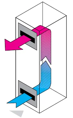 - Воздушный поток с одной выпускной решёткой такого же размера как вентилятор.