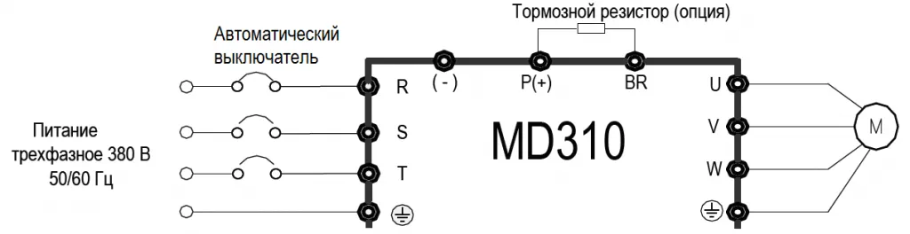 Три провода сетевого питания 380 В, 50 Гц — клеммы R, S, T + провод заземления PE. Нейтраль частотному преобразователю не нужна. Даже если она у вас есть, подключать не нужно. А вот провода питания можно подключать в любом порядке. При необходимости чередование фаз можно изменить в программе частотника.