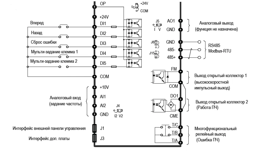 На дискретные — DO и аналоговые выходы AO преобразователь выдает информацию о своем текущем состоянии, скорости или токе двигателя, достижении заданных значений или выходе за их пределы. В нашем случае выходы не используются, поэтому подключать нечего.
