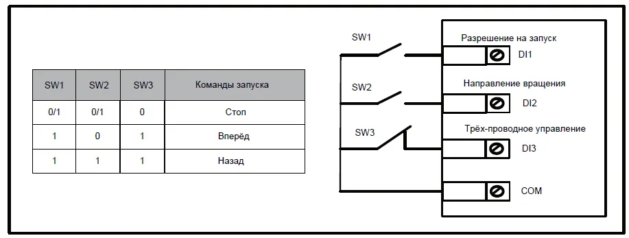 В нашем случае подойдёт трёхпроводное управление, где кнопка «Стоп» осуществляет разрешение на работу, кнопка «Старт» — запуск станка, а переключатель выбирает направление вращения.