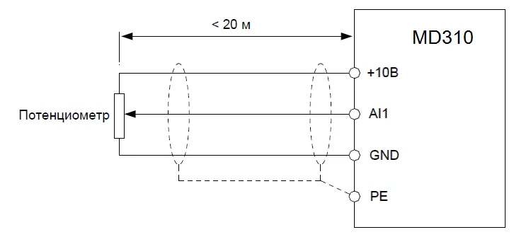 F0-03 = 2 — задание частоты с AI1 (потенциометр)