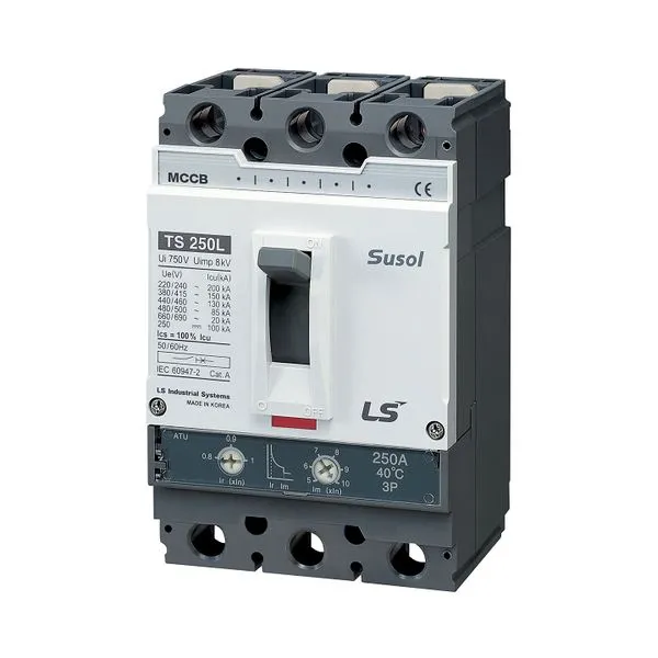 Автоматический выключатель Lsis, серии TS с электромагнитным расцепителем FMU для защиты кабелей и силовых трансформаторов от перегрузки и токов короткого замыкания. Уставка по перегрузке регулируется в пределах 0,8...1 от Iном. Уставка по току КЗ - фиксированная 10 от Iном..