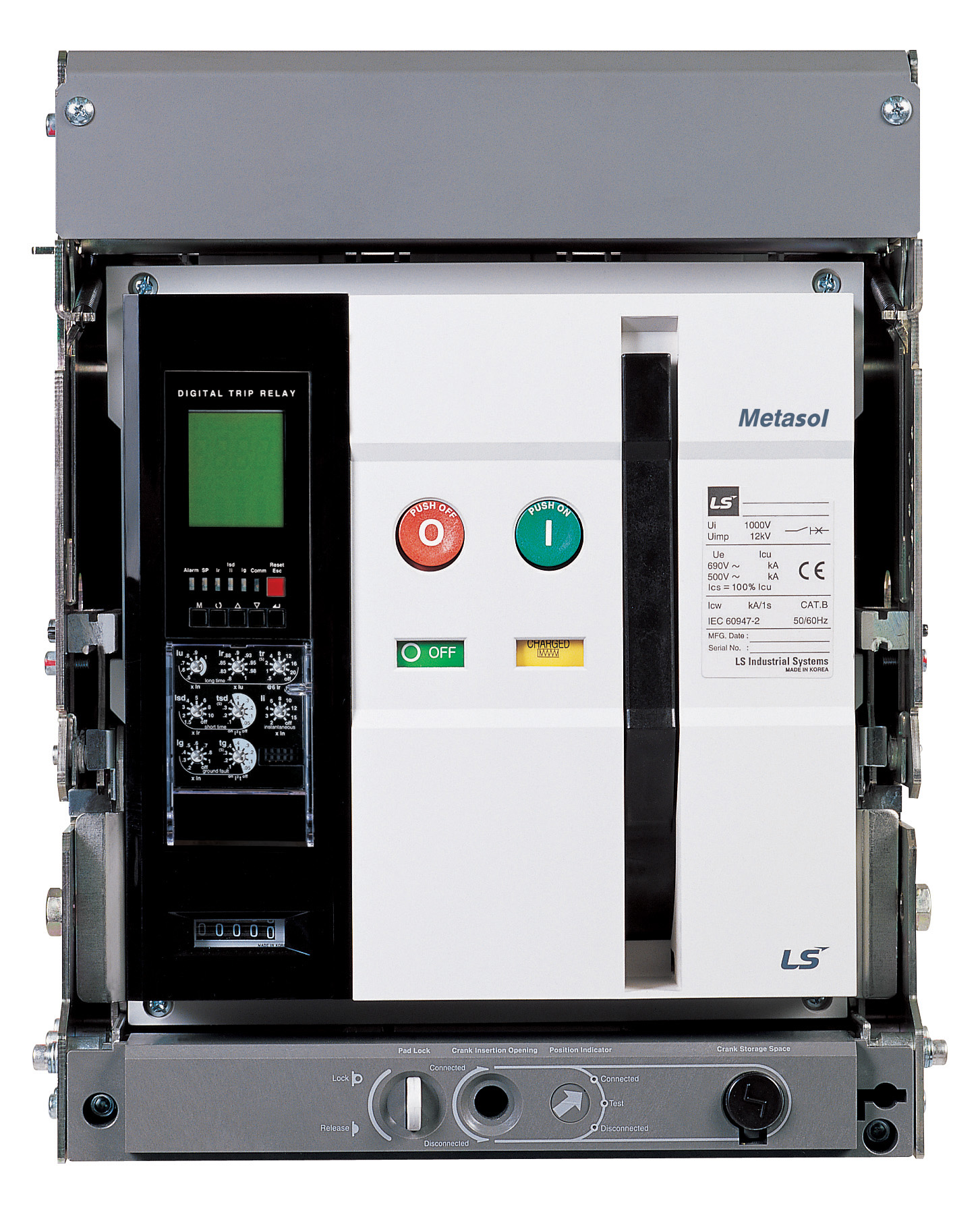 Воздушный автоматический выключатель LSIS, серии Metasol. Серия включается в себя трех и четырех полюсные автоматы, номинальными токами от 630 до 6300А, отключающей способностью от 65 до 150 кА, выкатного или стационарного исполнения.