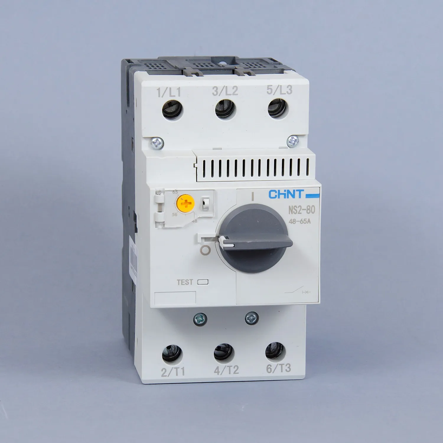 NS2 — серия ручных пускателей Chint для управления и защиты двигателей. В серию входят мотор-автоматы с кнопками управления и поворотной рукояткой до 80А, а также специальные боксы с защитой IP55. Все пускатели NS2 поддерживают установку вспомогательных контактов и независимых расцепителей.