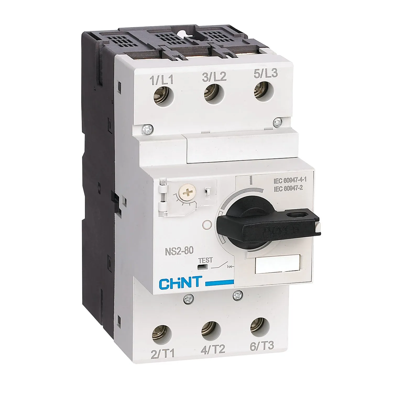 NS2 — серия ручных пускателей Chint для управления и защиты двигателей. В серию входят мотор-автоматы с кнопками управления и поворотной рукояткой до 80А, а также специальные боксы с защитой IP55. Все пускатели NS2 поддерживают установку вспомогательных контактов и независимых расцепителей.