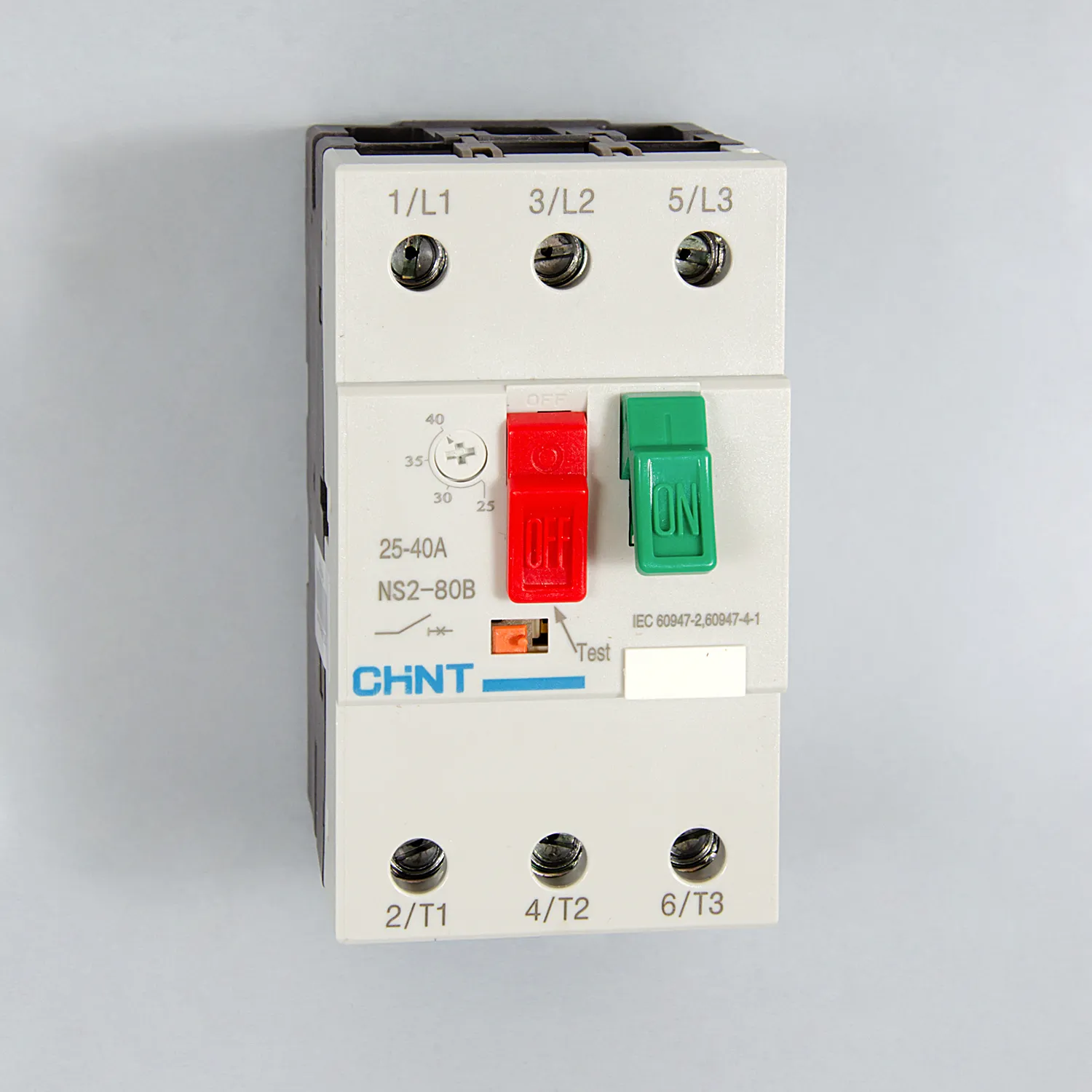 NS2 — серия ручных пускателей Chint для управления и защиты двигателей. В серию входят мотор-автоматы с кнопками управления и поворотной рукояткой до 80А, а также специальные боксы с защитой IP55. Для всех автоматов NS2-80B подходят независимые и минимальные расцепители, а также специальные боковые вспомогательные контакты. Аварийные контакты для NS2-80B и NS2-80 не подходят. Для модели NS2-80B фронтальные контакты неподходят (к моделям без индекса B подходят).