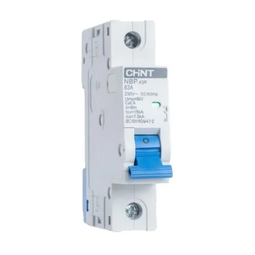 NBP-63R — серия автоматических выключателей с высокой отключающей способностью. Предельное значение Icu = 15кА, рабочее Ics = 7.5кА, электрическая износостойкость — 10 000 циклов, кривая отключения 8In.
