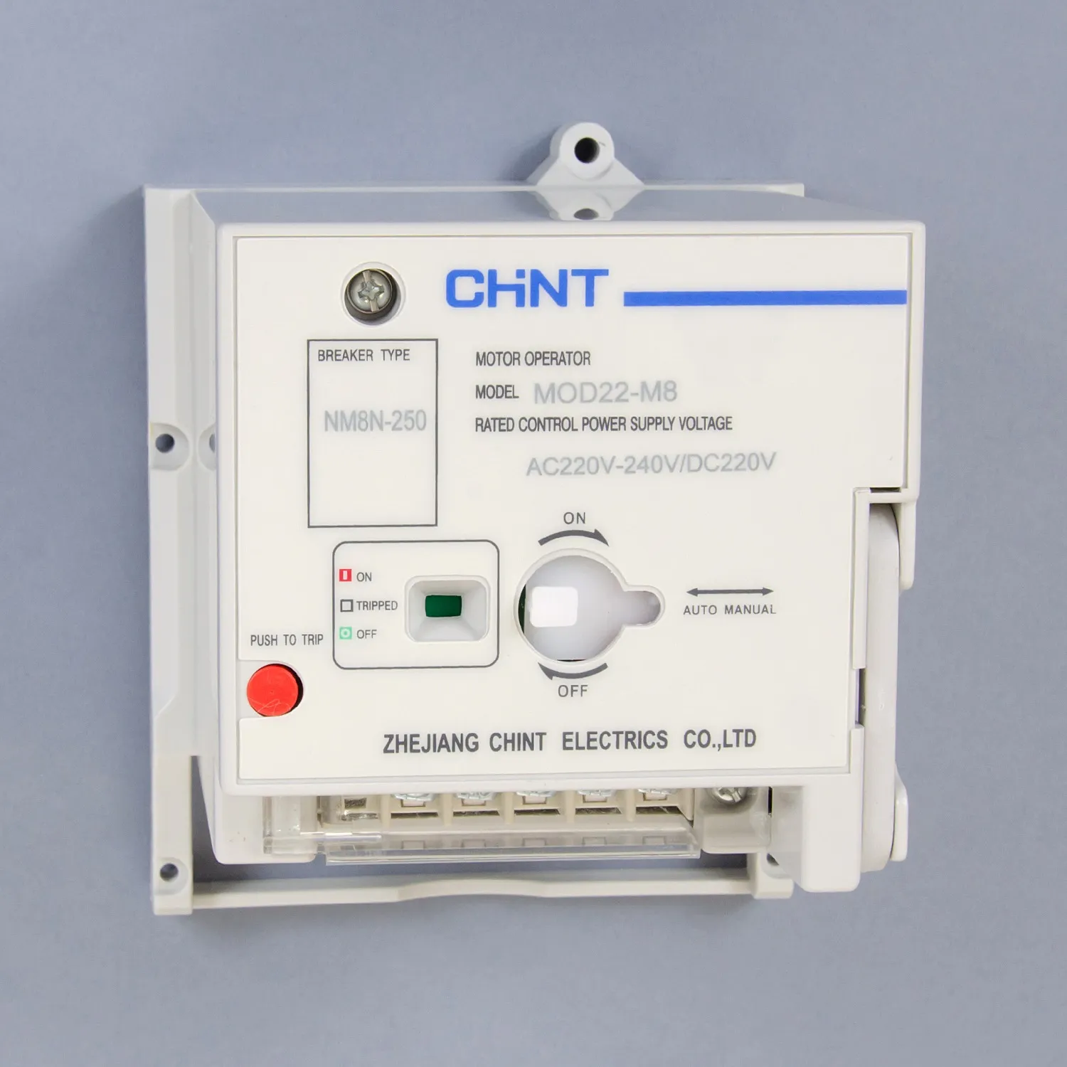 Моторный привод для дистанционного управления автоматическим выключателем NM8N габарита 250. При подаче напряжения на контакты привода, он переводит рукоятку автомата в положение «включено» или «выключено», в зависимости от того на какие клеммы подаётся напряжение.