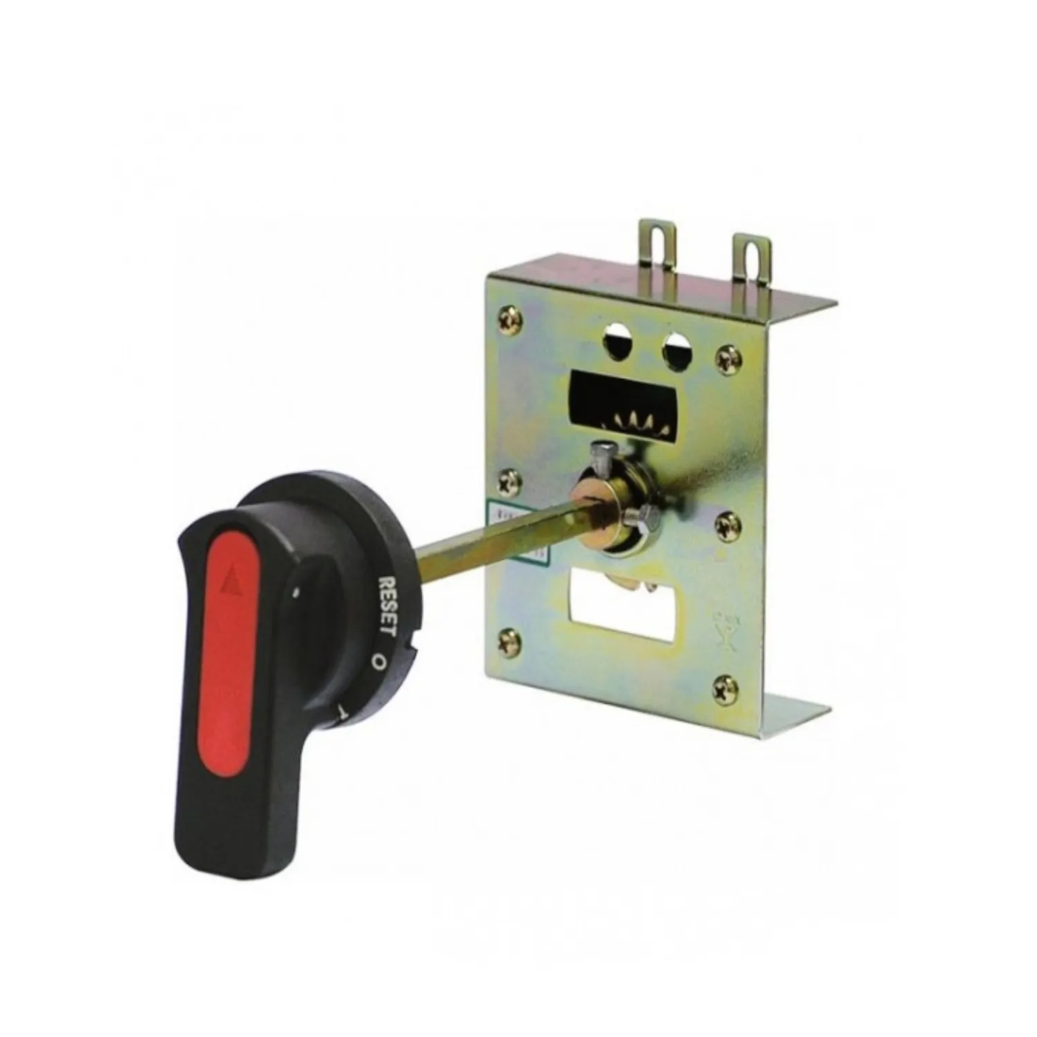 Выносная поворотная рукоятка для установки на дверь шкафа. Трехпозиционная индикация c функцией индикации отключения: O (разомкнут), I (замкнут) и свободное срабатывание. Автоматический выключатель может быть заблокирован в выключенном положении с помощью 1…3 замков с диаметром дужки 5…8 мм. За счет этого предотвращается замыкание автоматического выключателя и открывание дверцы шкафа. Когда выключатель находится в положении включения, дверцу шкафа нельзя открыть с помощью поворотной рукоятки (при необходимости открывания двери в чрезвычайной ситуации это можно сделать, сняв аварийную блокировку на рукоятке).