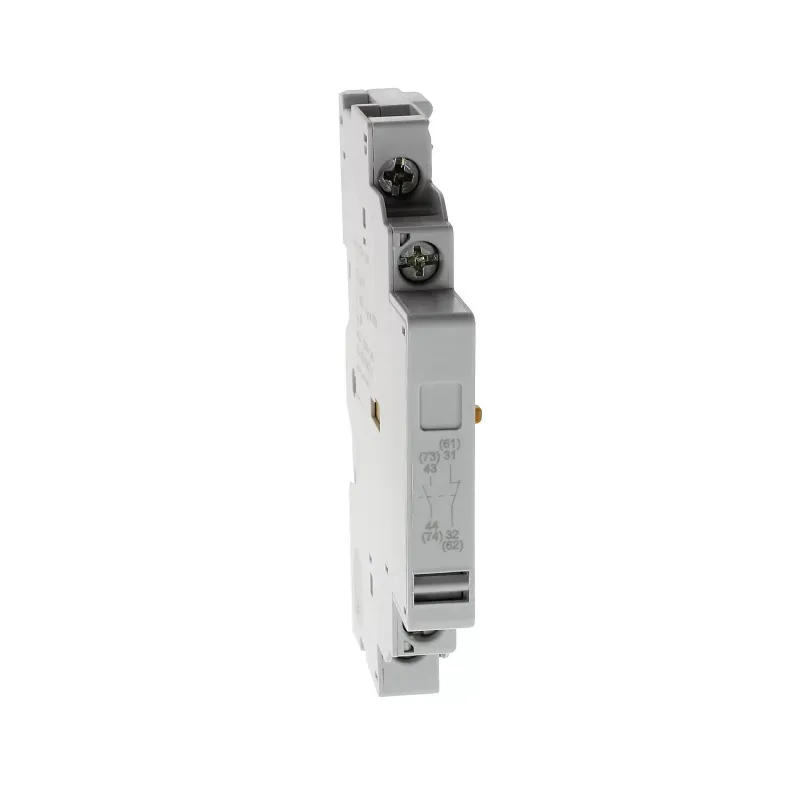 Служит для сигнализации состояния автоматического выключателя (вкл/выкл). Устанавливаются на левую боковую стенку автоматического выключателя. На один выключатель можно установить 2 блока вспомогательных контактов. Срабатывают мгновенно.