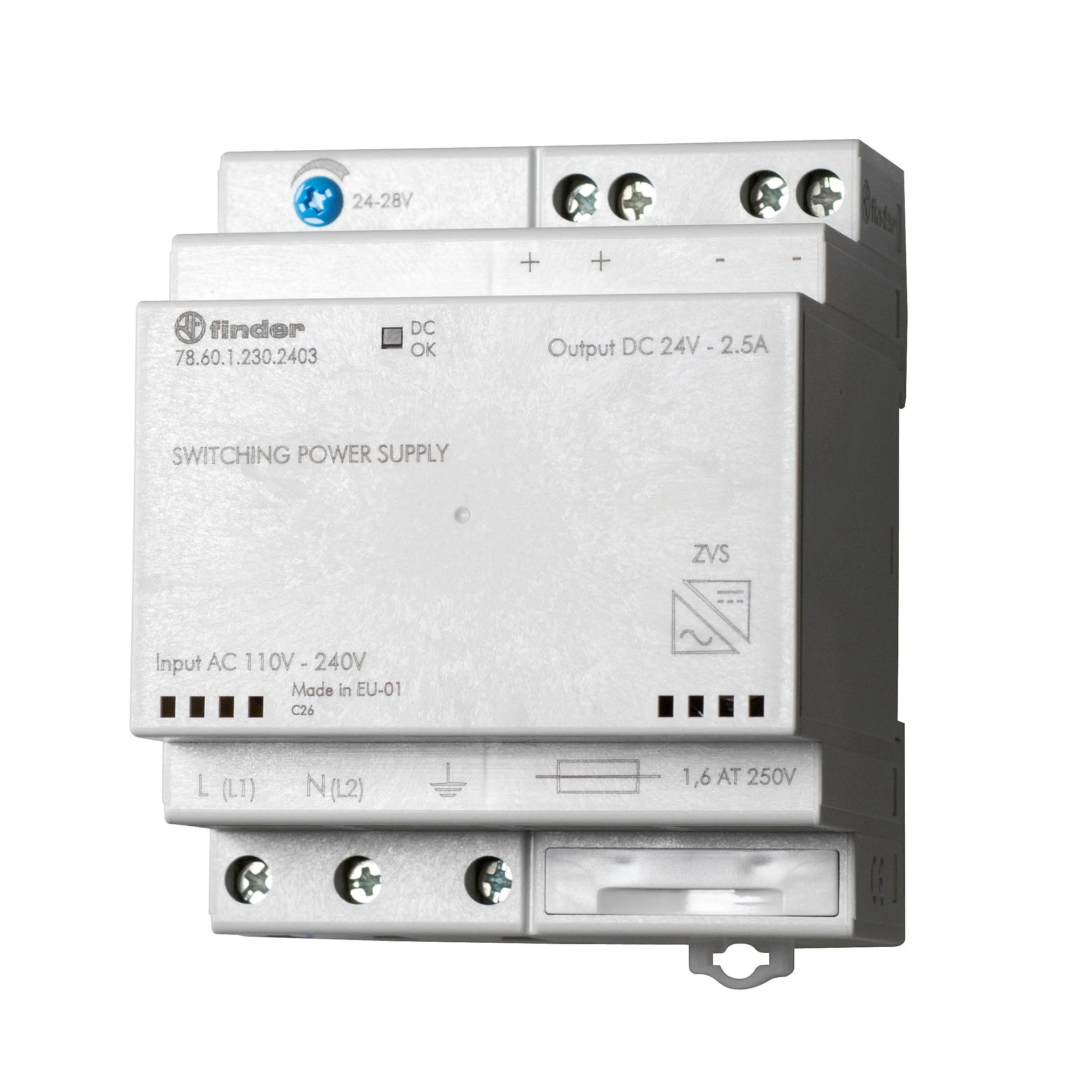 78 серия блоков питания Finder мощностями от 12 до 240 Вт. Универсальное входное напряжение постоянного и переменного тока позволяет применять устройство не только как преобразователь напряжения, но и как стабилизатор постоянного тока. Выходное напряжение бывает номиналов 12 или 24 В постоянного тока, а отклонение от заданной величины напряжения составляет ±1 %.
