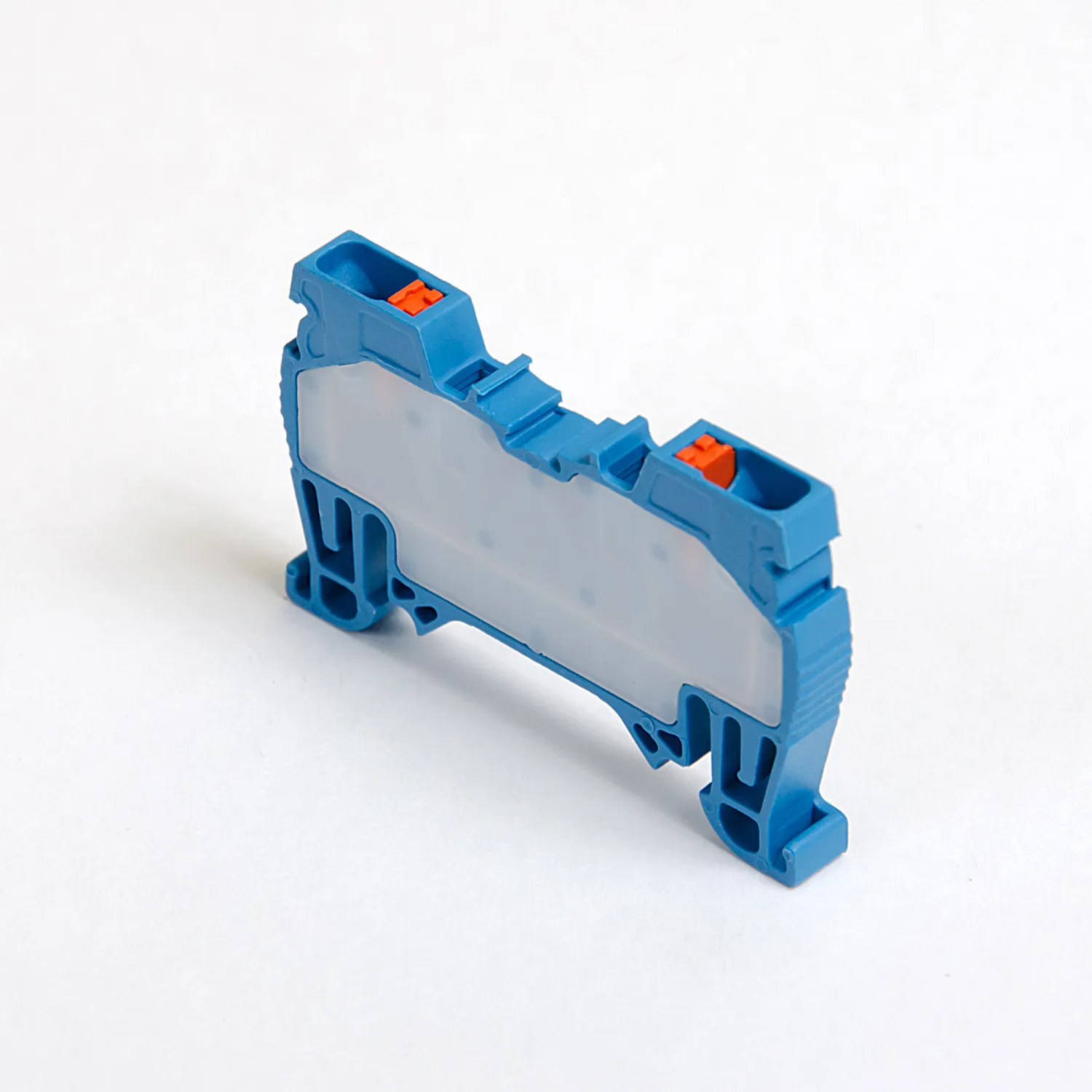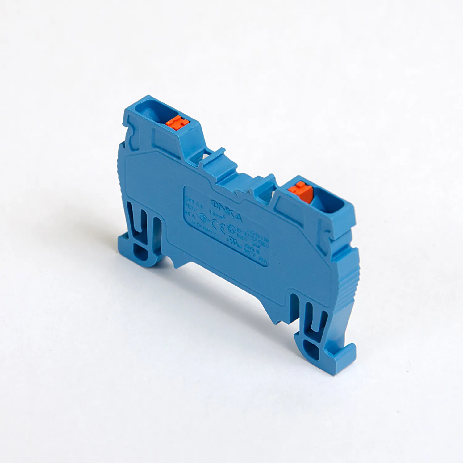 Встроенная боковая заглушка — это отличительная черта клемм Onka. Токоведущая часть закрыта с обеих сторон и боковая заглушка не потребуется при монтаже, за это приходится расплачиваться чуть большей шириной клеммы, что заметно для клемм 2,5…4 мм². Версия клемм SLIM по ширине совпадает с популярными брендами имеющими открытую токоведущую часть. Корпус клеммы изготовлен из полиамида 6.6, зажим из стали, а токопроводящая часть из лужёной меди.
