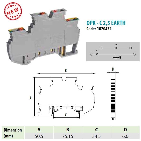 1020432 | OPK 2,5-2CT1 | Клеммник пруж.быстрозажимной (Push in) 2-хярусный,1. с конт. на DIN-рейку, 2,5 мм.кв.,, Onka
