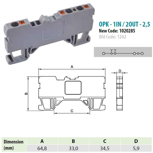 1020290 | OPK 2,5E | Клеммник пруж.быстрозажимной (Push in), 3-х выводной, 2,5мм.кв., (красный), 1267, Onka