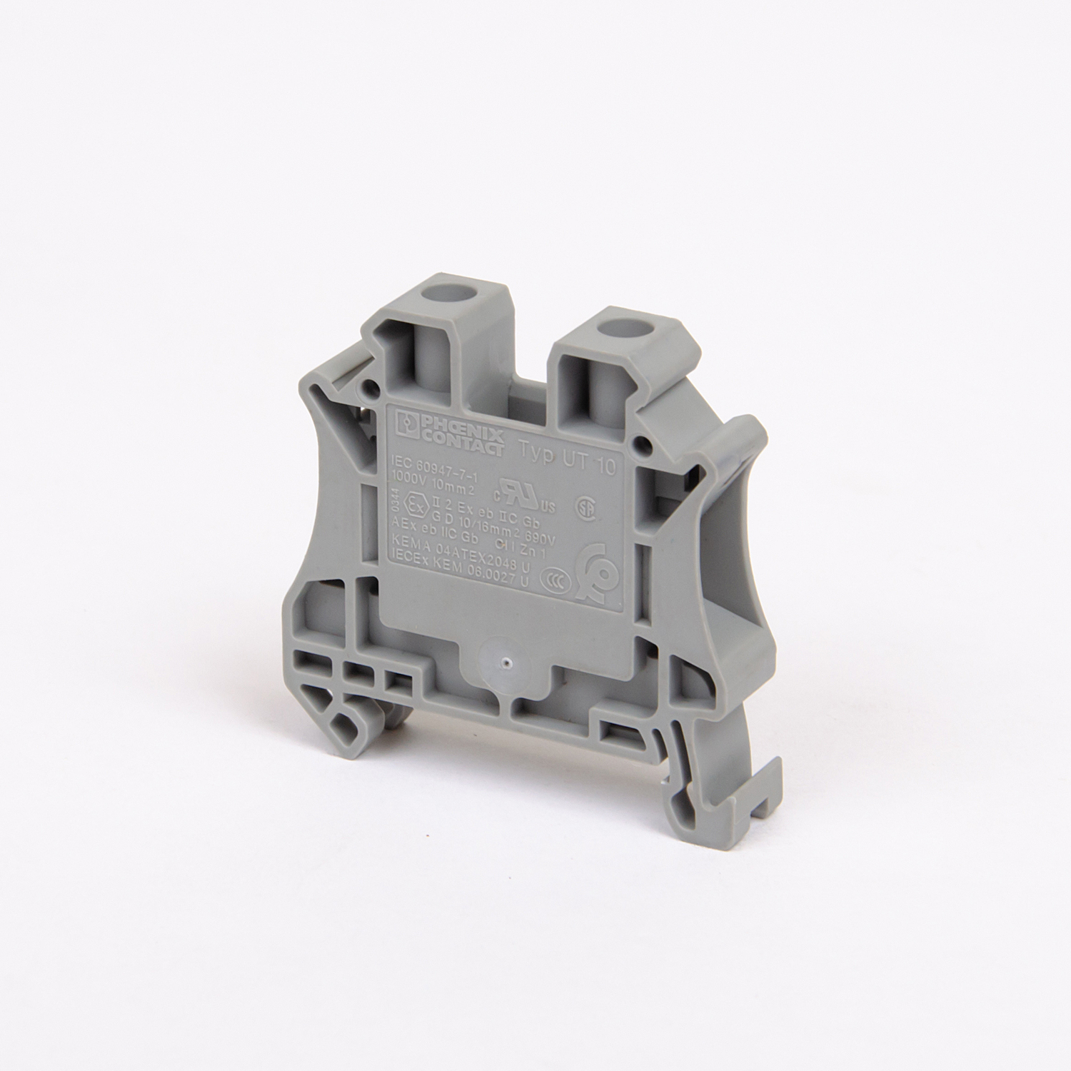 Корпуса клемм серии UT изготовлены из серого пластика, литая зажимная клетка из никелированного медного сплава.