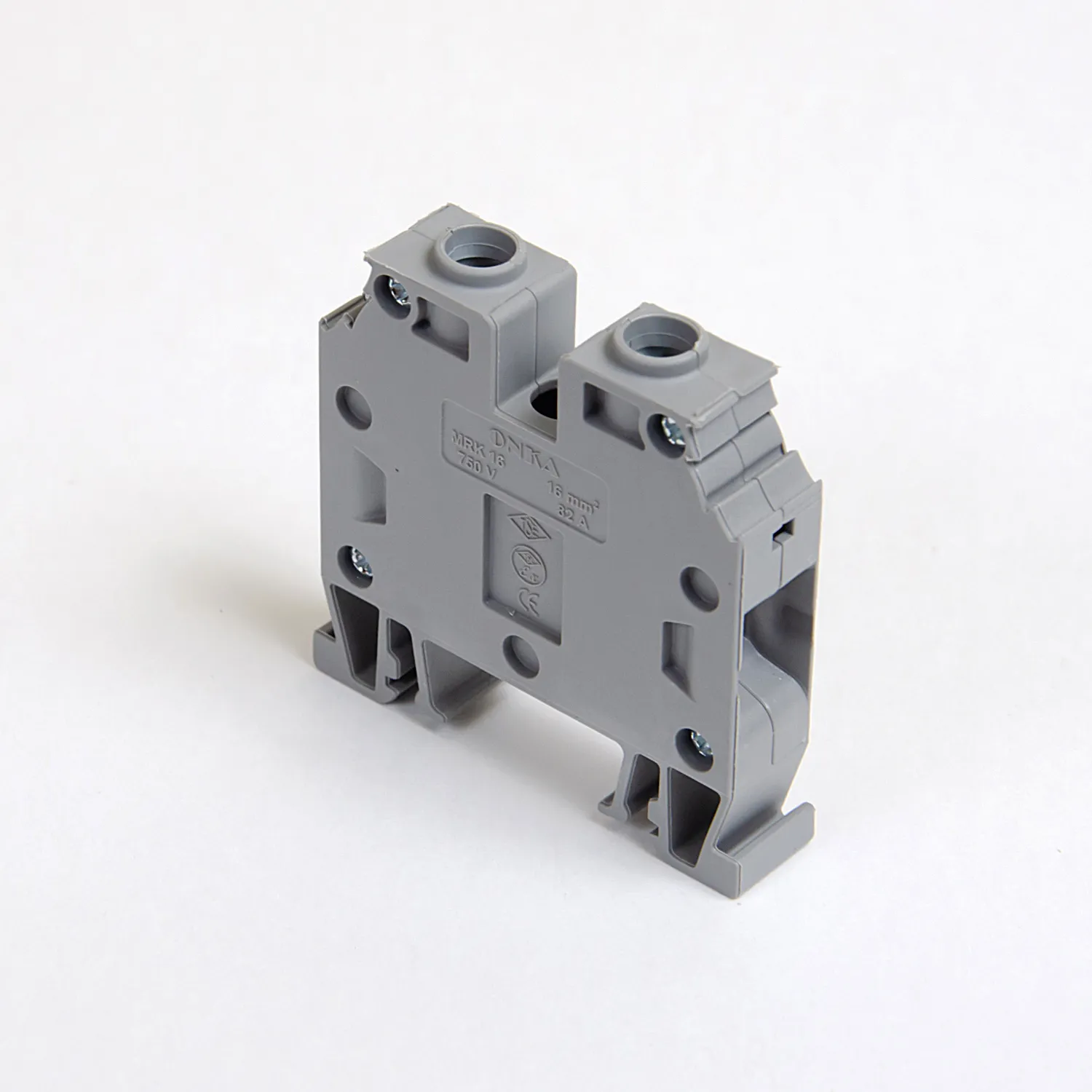 Встроенная боковая заглушка — это отличительная черта клемм Onka. Токоведущая часть закрыта с обеих сторон и боковая заглушка не потребуется при монтаже, за это приходится расплачиваться чуть большей шириной клеммы — это заметно для клемм 2,5…4 мм². Версия клемм SLIM по ширине совпадает с популярными брендами имеющими открытую токоведущую часть. Корпус клеммы изготовлены из полиамида 6.6, зажимная клетка из оцинкованной стали с самоконтрящейся конструкцией винтового зажима, а токопроводящая часть из лужёной меди.