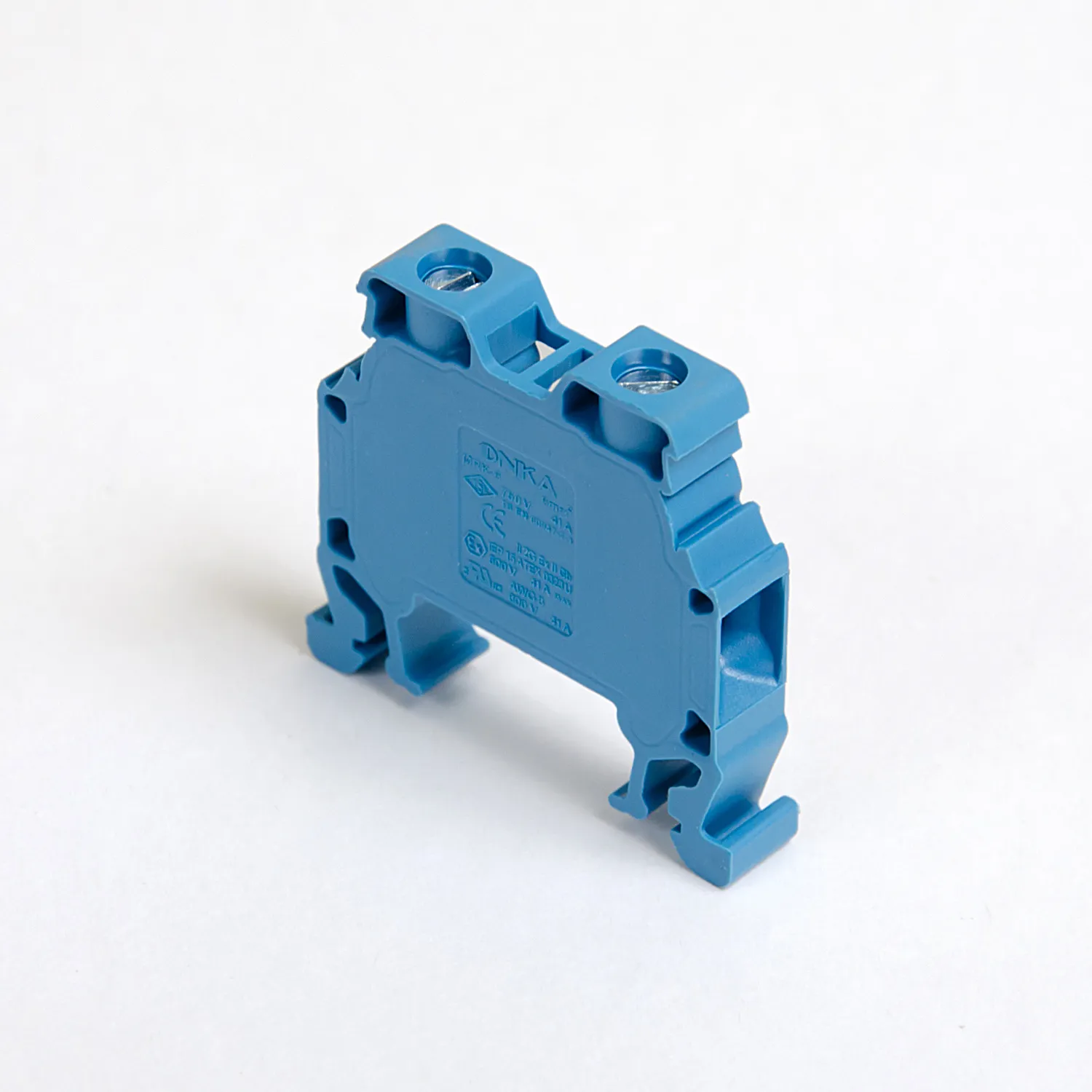 Встроенная боковая заглушка — это отличительная черта клемм Onka. Токоведущая часть закрыта с обеих сторон и боковая заглушка не потребуется при монтаже, за это приходится расплачиваться чуть большей шириной клеммы — это заметно для клемм 2,5…4 мм². Версия клемм SLIM по ширине совпадает с популярными брендами имеющими открытую токоведущую часть. Корпус клеммы изготовлены из полиамида 6.6, зажимная клетка из оцинкованной стали с самоконтрящейся конструкцией винтового зажима, а токопроводящая часть из лужёной меди.