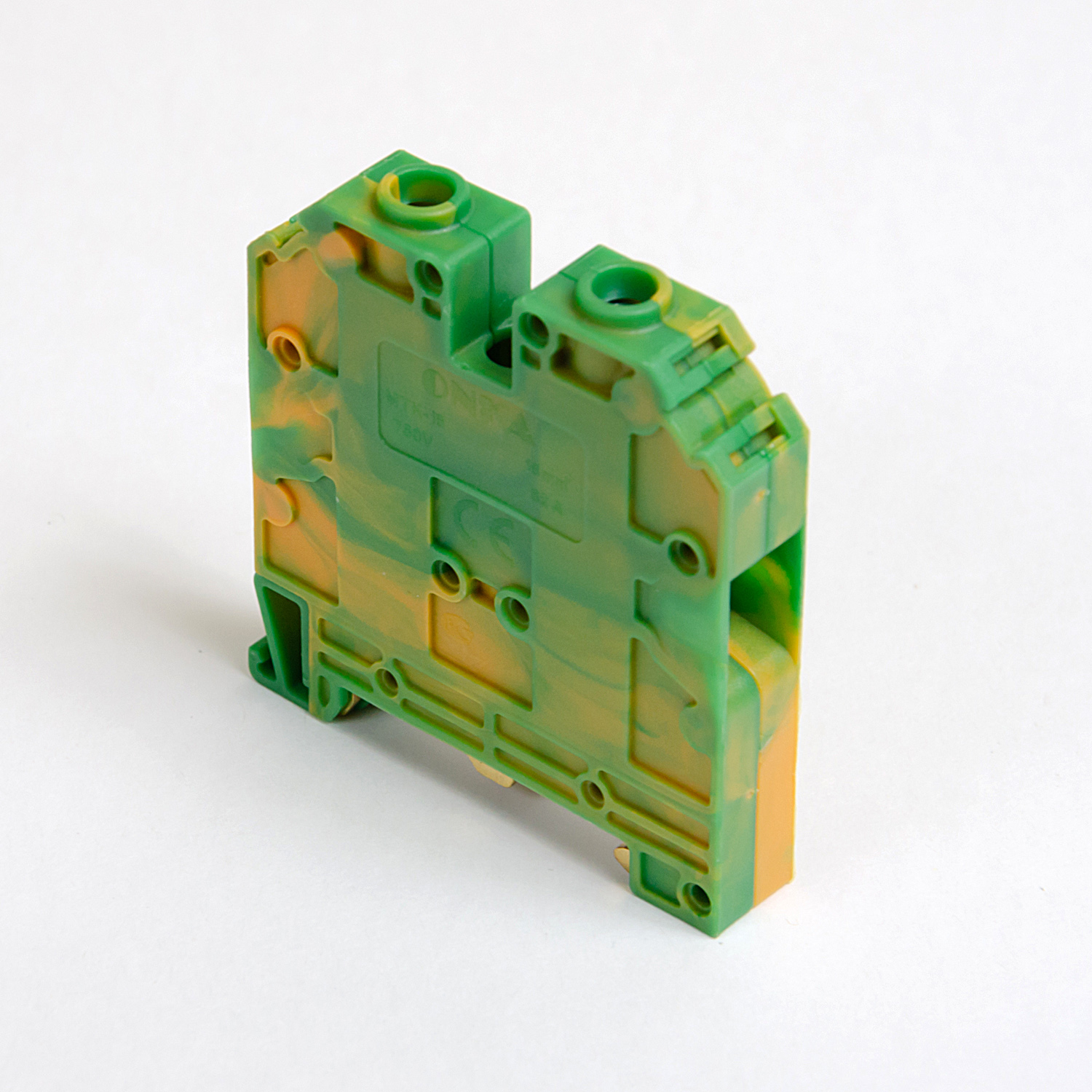 Клеммы заземления оснащены электрическим контактом с DIN-рейкой, это позволяет отказаться от классической шины заземления в цепях небольшой мощности. Стальная рейка 35х7,5 эквивалентна медному проводнику сечением 16мм², а 35х15 проводнику 50мм², подробнее в ГОСТ IEC 60947-7-2-2016. Жёлто-зелёный цвет клеммы обозначает цепь заземления, согласно ПУЭ этот цвет нельзя использовать в других цепях.