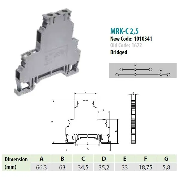 1010341 | MRK 2,5CK | Клеммник 2-х ярусный, 2,5 мм.кв., с внутр.перемычкой. (серый), 1622, Onka