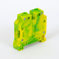Клеммы заземления оснащены электрическим контактом с DIN-рейкой, это позволяет отказаться от классической шины заземления в цепях небольшой мощности. Стальная рейка 35х7,5 эквивалентна медному проводнику сечением 16мм², а 35х15 проводнику 50мм², подробнее в ГОСТ IEC 60947-7-2-2016. Жёлто-зелёный цвет клеммы обозначает цепь заземления, согласно ПУЭ этот цвет нельзя использовать в других цепях.