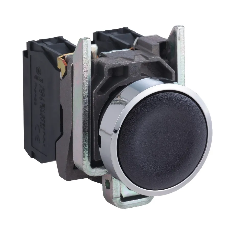 Кнопка с пружинным возвратом, с потайным толкателем чёрного цвета и одним нормально разомкнутым контактом. Комплектное устройство готовое к монтажу.
