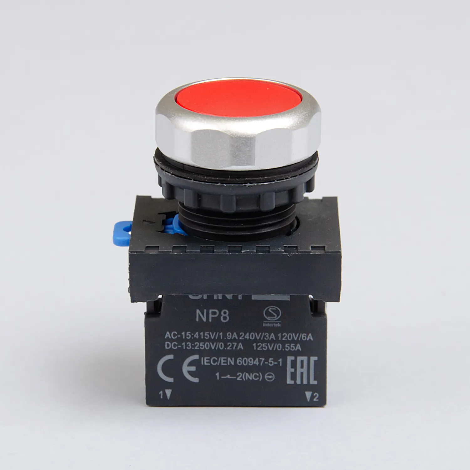 NP8 — серия кнопок, индикаторов и переключателей Chint с высокой степенью защиты от воды и пыли: IP65. Отличатся от серии NP2 не только защитой. NP8 имеют модульную конструкцию с универсальным быстросъёмным пластиковым основанием, подходящим ко всем головкам кнопок и переключателям. Крепление дополнительных контактов на защёлках. Внешне отличаются насыщенными цветами элементов управления, декоративным хромированным кольцом и более яркими светодиодами.