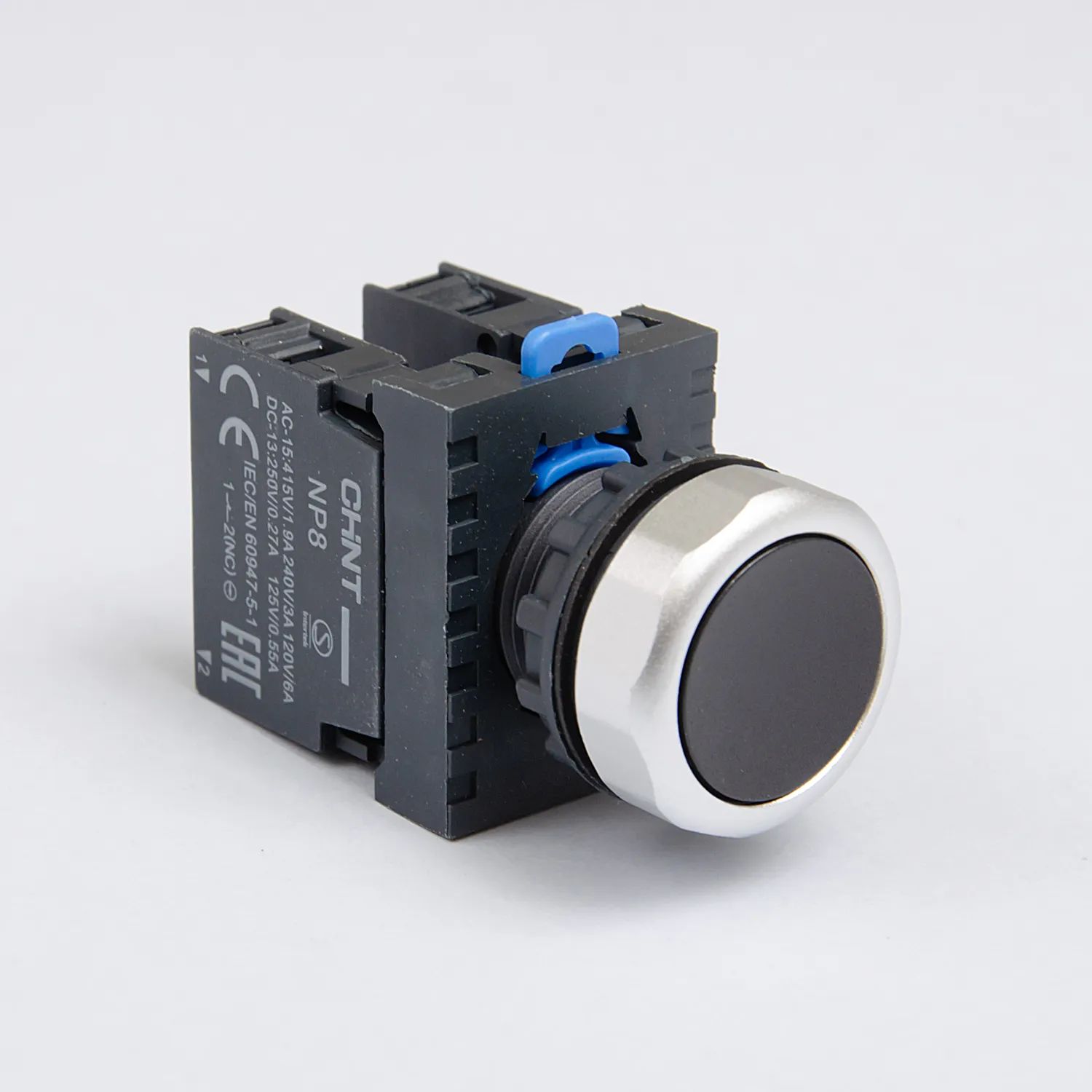 NP8 — серия кнопок, индикаторов и переключателей Chint с высокой степенью защиты от воды и пыли: IP65. Отличатся от серии NP2 не только защитой. NP8 имеют модульную конструкцию с универсальным быстросъёмным пластиковым основанием, подходящим ко всем головкам кнопок и переключателям. Крепление дополнительных контактов на защёлках. Внешне отличаются насыщенными цветами элементов управления, декоративным хромированным кольцом и более яркими светодиодами.