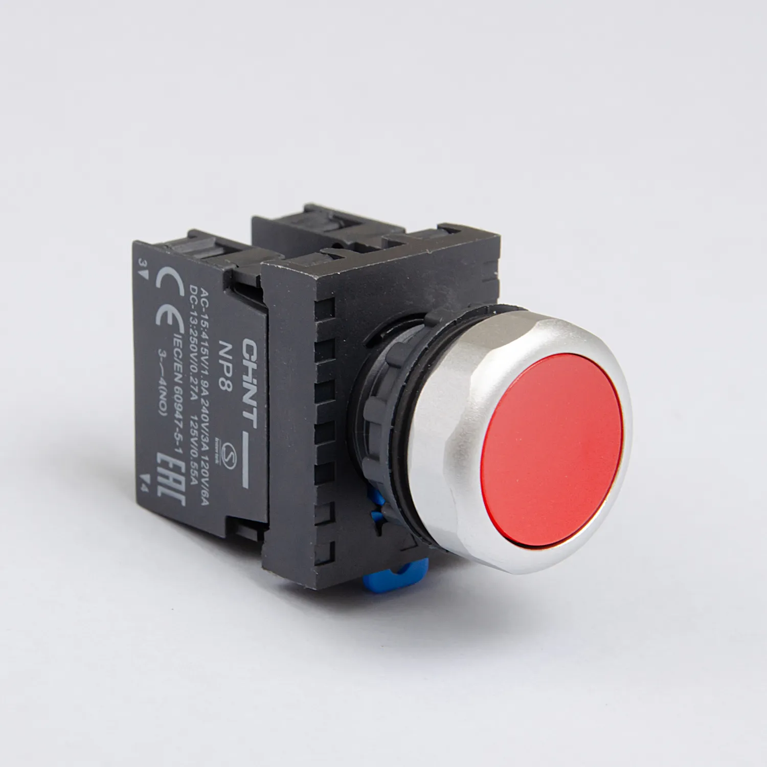 NP8 — серия кнопок, индикаторов и переключателей Chint с высокой степенью защиты от воды и пыли: IP65. Отличатся от серии NP2 не только защитой. NP8 имеют модульную конструкцию с универсальным быстросъёмным пластиковым основанием, подходящим ко всем головкам кнопок и переключателям. Крепление дополнительных контактов на защёлках. Внешне отличаются насыщенными цветами элементов управления, декоративным хромированным кольцом и более яркими светодиодами.