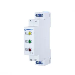Индикатор фаз РН-12 предназначен для индикации наличия фазных напряжений в трёхфазной сети переменного тока. При подаче на РН-12 напряжения изделие индицирует его наличие на фазах, соответствующих маркировке, относительно нулевого провода. Монтируется РН-12 на Дин-рейке 35 мм.