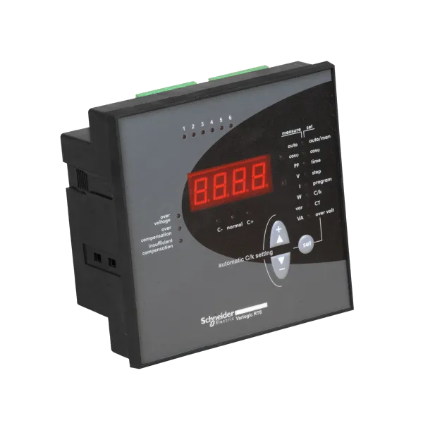 Контроллер Varlogic RT Schneider Electric управляет ступенями УКРМ для поддержания необходимого уровня реактивной мощности в сети. Комбинирование ступеней УКРМ выбирается из готовых алгоритомв, заранее установленных в устройство.