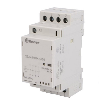 Модульные контакторы 22 серии Finder. Модульные контакторы включают и выключают свет, отопление, вентиляцию, подачу воды по сигналу другого устройства: контроллера, реле или термостата.