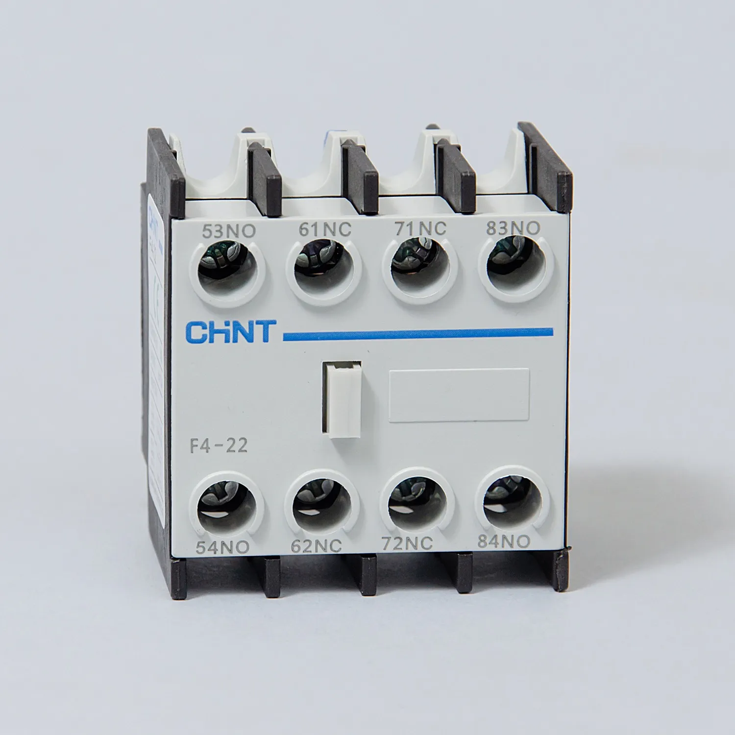 F4-22 — вспомогательные контакты фронтальной установки для контакторов Сhint серий NC1 и NC2. Контактные приставки также выпускаются с другими комбинациями контактов и выдержкой времени, а для серии NC1 доступны контакты бокового монтажа: NCF1-11 C.