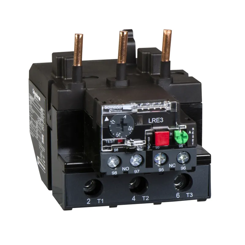 Тепловое реле предназначено для защиты двигателей или цепей переменного тока от перегрузки, превышения времени запуска, обрыва фазы и заклинивания ротора. Реле постоянно контролирует ток, протекающий через него. При превышении уставки, вспомогательные контакты реле изменяют свое состояние и вызывают остановку электродвигателя, если они подключены в разрыв цепи управления катушкой контактора.