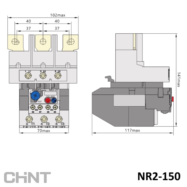 NR2-150 — тепловые реле для контакторов Chint серии NC1-115 и NC1-150. Предназначены для защиты двигателей переменного тока от перегрузки и обрыва фазы. Реле оснащены компенсацией влияния температуры окружающей среды. Предусматривают работу в двух режимах: с автоматическим и ручным сбросом аварии. Теплове реле не защищает от токов короткого замыкания, поэтому использование автоматического выключателя или предохранителя остаётся обязательным.