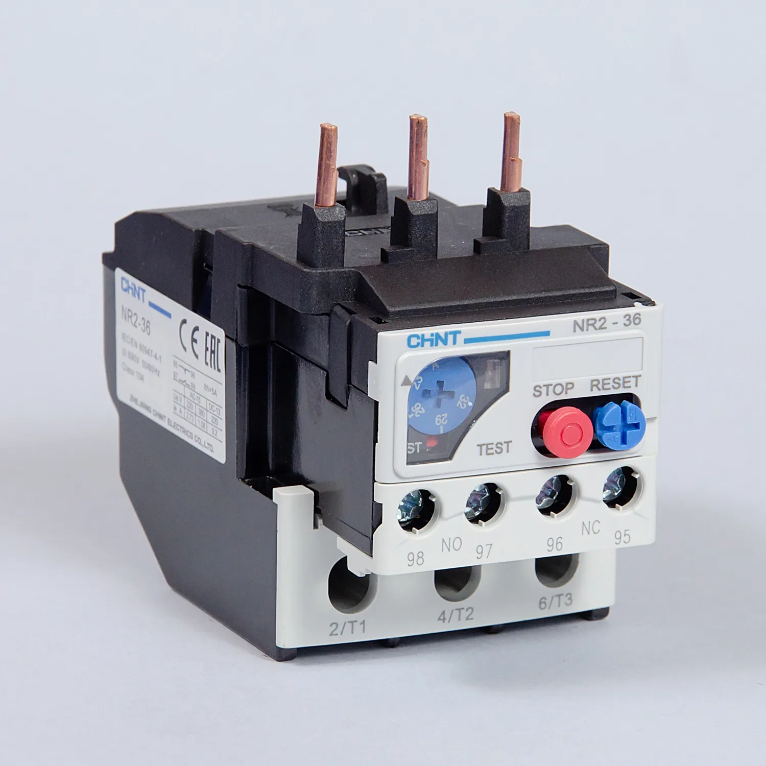 NR2-36 — тепловые реле для контакторов Chint серии NC1-32. Предназначены для защиты двигателей переменного тока от перегрузки и обрыва фазы. Реле оснащены компенсацией влияния температуры окружающей среды. Предусматривают работу в двух режимах: с автоматическим и ручным сбросом аварии. Теплове реле не защищает от токов короткого замыкания, поэтому использование автоматического выключателя или предохранителя остаётся обязательным.