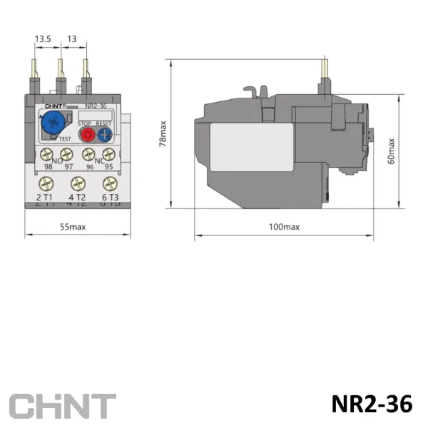 NR2-36 — тепловые реле для контакторов Chint серии NC1-32. Предназначены для защиты двигателей переменного тока от перегрузки и обрыва фазы. Реле оснащены компенсацией влияния температуры окружающей среды. Предусматривают работу в двух режимах: с автоматическим и ручным сбросом аварии. Теплове реле не защищает от токов короткого замыкания, поэтому использование автоматического выключателя или предохранителя остаётся обязательным.