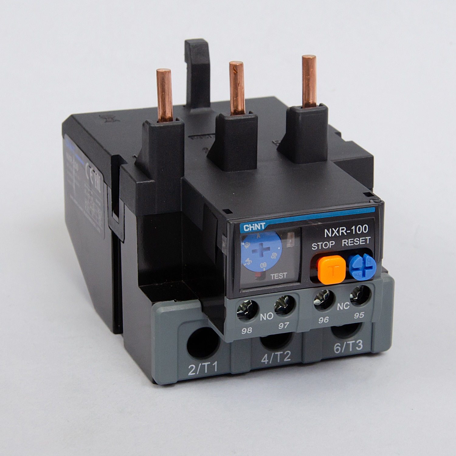 Next NXR — серия тепловых реле Chint для защиты двигателей переменного тока от перегрузки и обрыва фазы. Реле оснащены температурной компенсацией, кнопкой «тест» и работают в двух режимах: ручной сброс аварии и автоматический сброс с задержкой срабатывания. Исключение - модели NXR-200 и NXR-630, они оснащены только ручным сбросом. Модель NXR-100 может быть установлена только на универсальные контакторы моделей NXC-40, 50, 65, 75, 85, 100 и выпускается с номинальным током от 63 до 100А. Тепловые реле не защищают от короткого замыкания, использование автоматического выключатели или предохранителя остаётся обязательным. Для реле 65А рекомендуется использование предохранителя 100А с кривой gG.