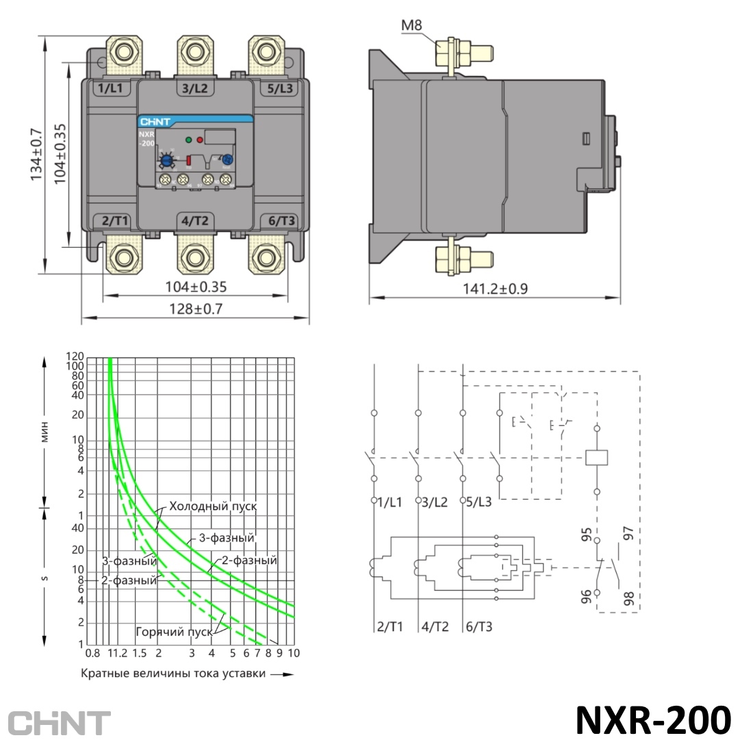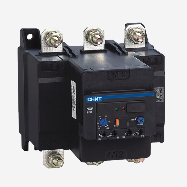 Next NXR — серия тепловых реле Chint для защиты двигателей переменного тока от перегрузки и обрыва фазы. Реле оснащены температурной компенсацией, кнопкой «тест» и работают в двух режимах: ручной сброс аварии и автоматический сброс с задержкой срабатывания. Исключение - модели NXR-200 и NXR-630, они оснащены только ручным сбросом. Модель NXR-200 может быть устанавливается отдельно и выпускается с номинальным током от 80 до 200А. Тепловые реле не защищают от короткого замыкания, использование автоматического выключатели или предохранителя остаётся обязательным. Для реле 200А рекомендуется использование предохранителя 315А с кривой gG.