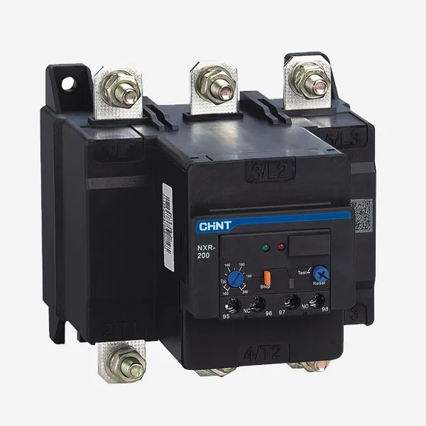 Next NXR — серия тепловых реле Chint для защиты двигателей переменного тока от перегрузки и обрыва фазы. Реле оснащены температурной компенсацией, кнопкой «тест» и работают в двух режимах: ручной сброс аварии и автоматический сброс с задержкой срабатывания. Исключение - модели NXR-200 и NXR-630, они оснащены только ручным сбросом. Модель NXR-200 может быть устанавливается отдельно и выпускается с номинальным током от 80 до 200А. Тепловые реле не защищают от короткого замыкания, использование автоматического выключатели или предохранителя остаётся обязательным. Для реле 160А рекомендуется использование предохранителя 315А с кривой gG.