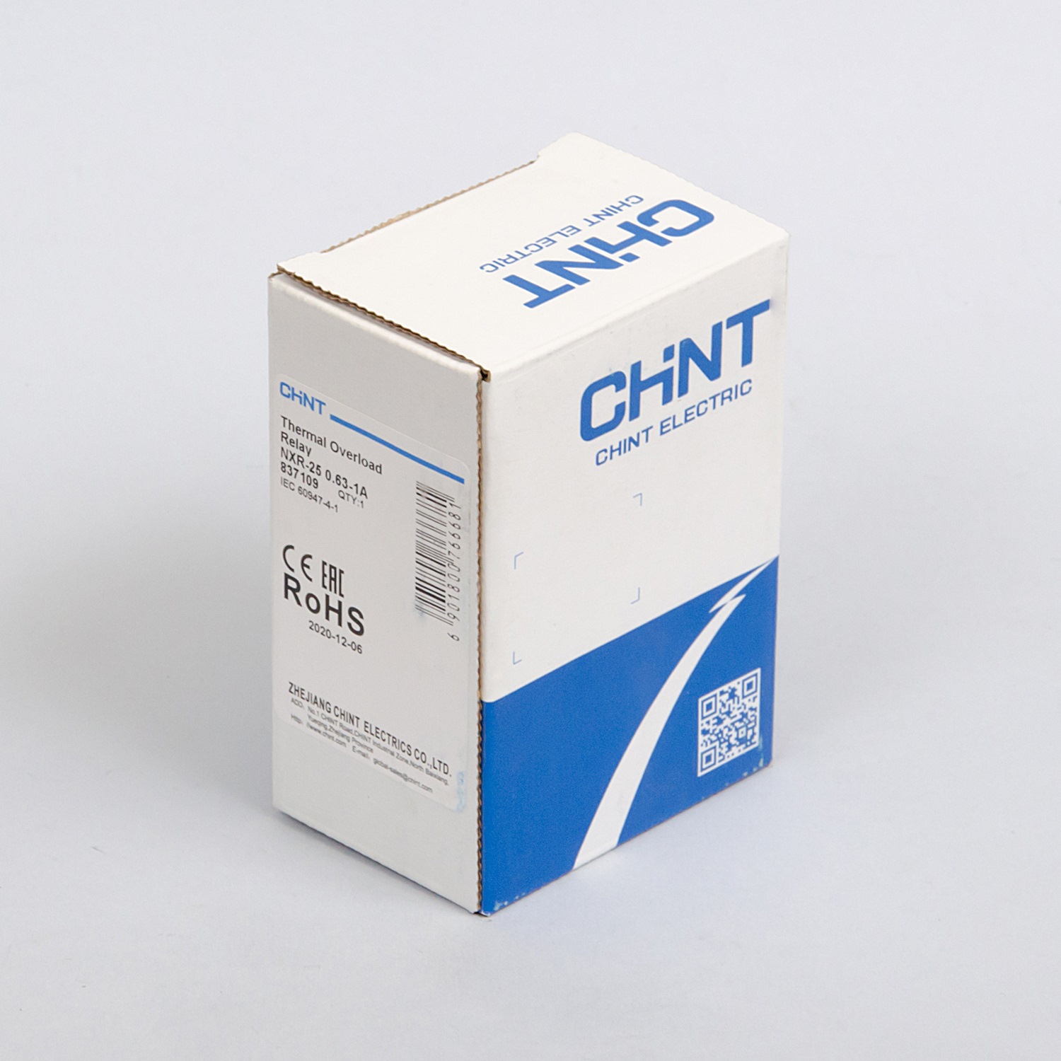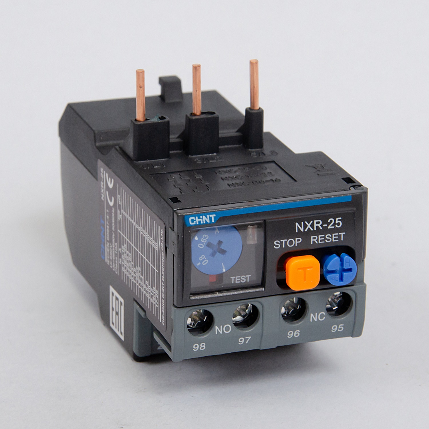 Next NXR — серия тепловых реле Chint для защиты двигателей переменного тока от перегрузки и обрыва фазы. Реле оснащены температурной компенсацией, кнопкой «тест» и работают в двух режимах: ручной сброс аварии и автоматический сброс с задержкой срабатывания. Исключение - модели NXR-200 и NXR-630, они оснащены только ручным сбросом. Модель NXR-25 может быть установлена только на универсальные контакторы моделей NXC-06, 09, 12, 16, 18, 22, 25, 32, 38 и выпускается с номинальным током от 0,1 до 25А. Тепловые реле не защищают от короткого замыкания, использование автоматического выключатели или предохранителя остаётся обязательным. Для реле 1А рекомендуется использование предохранителя 4А с кривой gG.