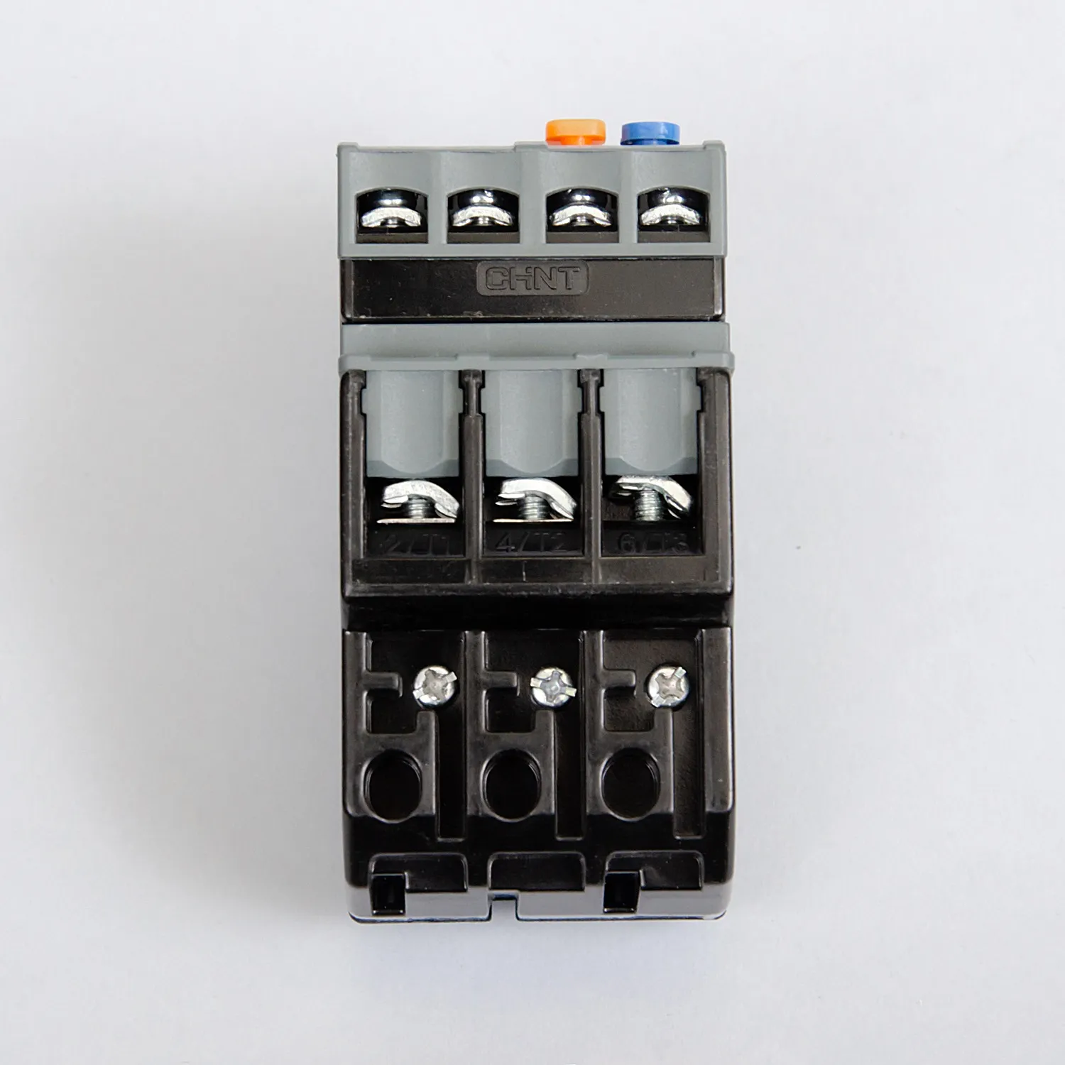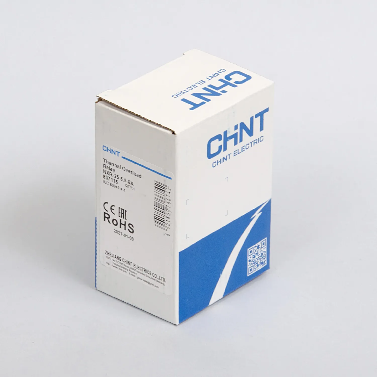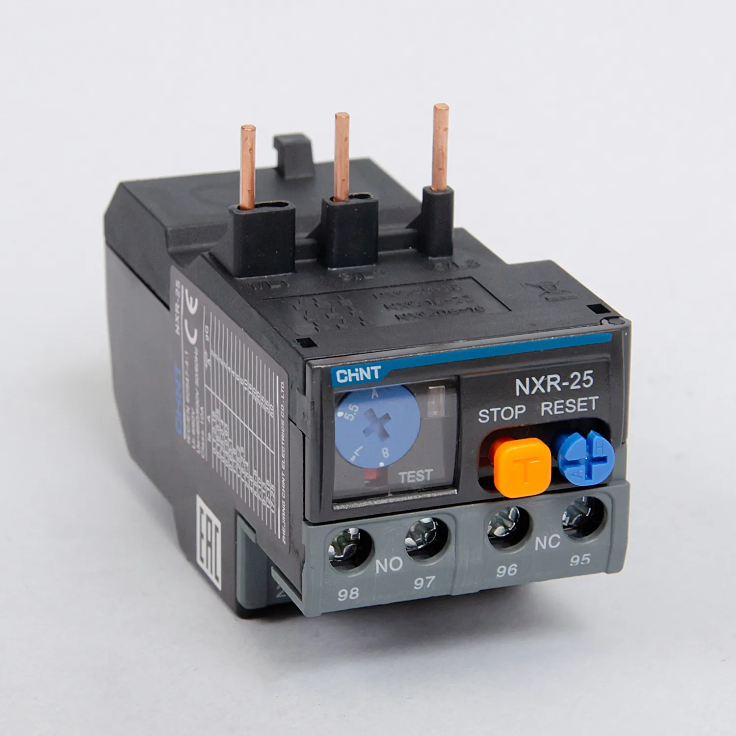 Next NXR — серия тепловых реле Chint для защиты двигателей переменного тока от перегрузки и обрыва фазы. Реле оснащены температурной компенсацией, кнопкой «тест» и работают в двух режимах: ручной сброс аварии и автоматический сброс с задержкой срабатывания. Исключение - модели NXR-200 и NXR-630, они оснащены только ручным сбросом. Модель NXR-25 может быть установлена только на универсальные контакторы моделей NXC-06, 09, 12, 16, 18, 22, 25, 32, 38 и выпускается с номинальным током от 0,1 до 25А. Тепловые реле не защищают от короткого замыкания, использование автоматического выключатели или предохранителя остаётся обязательным. Для реле 8А рекомендуется использование предохранителя 20А с кривой gG.