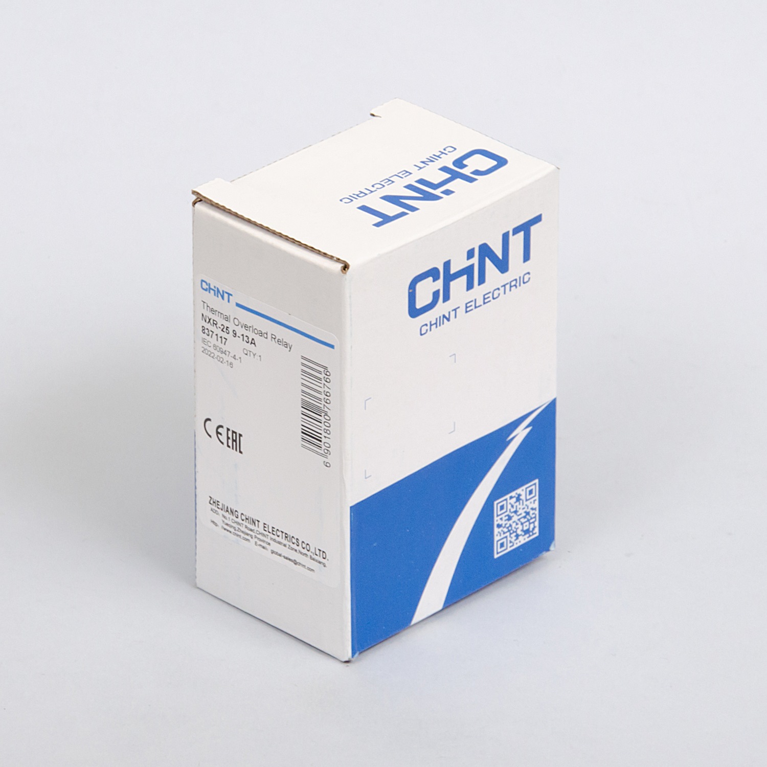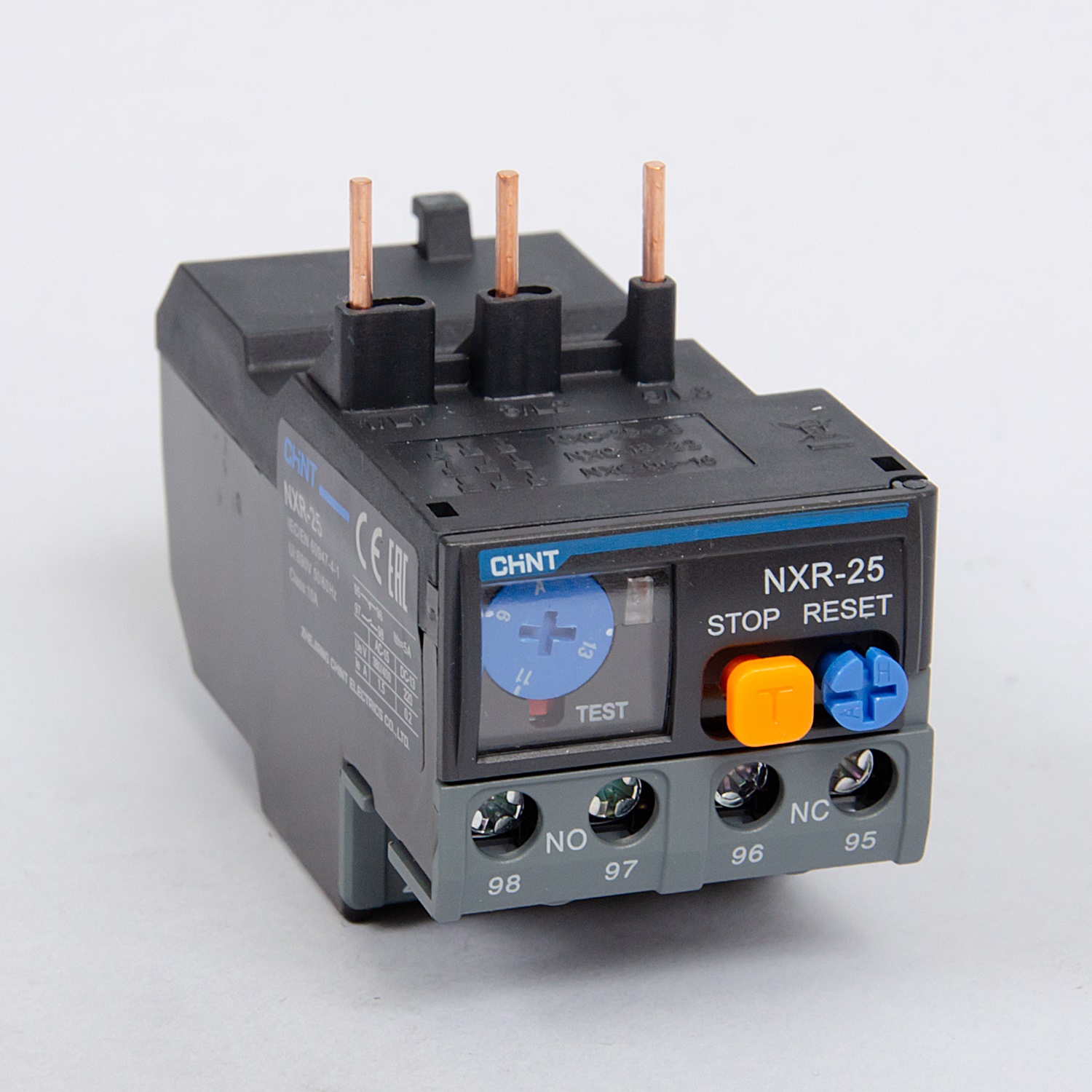 Next NXR — серия тепловых реле Chint для защиты двигателей переменного тока от перегрузки и обрыва фазы. Реле оснащены температурной компенсацией, кнопкой «тест» и работают в двух режимах: ручной сброс аварии и автоматический сброс с задержкой срабатывания. Исключение - модели NXR-200 и NXR-630, они оснащены только ручным сбросом. Модель NXR-25 может быть установлена только на универсальные контакторы моделей NXC-06, 09, 12, 16, 18, 22, 25, 32, 38 и выпускается с номинальным током от 0,1 до 25А. Тепловые реле не защищают от короткого замыкания, использование автоматического выключатели или предохранителя остаётся обязательным. Для реле 13А рекомендуется использование предохранителя 25А с кривой gG.