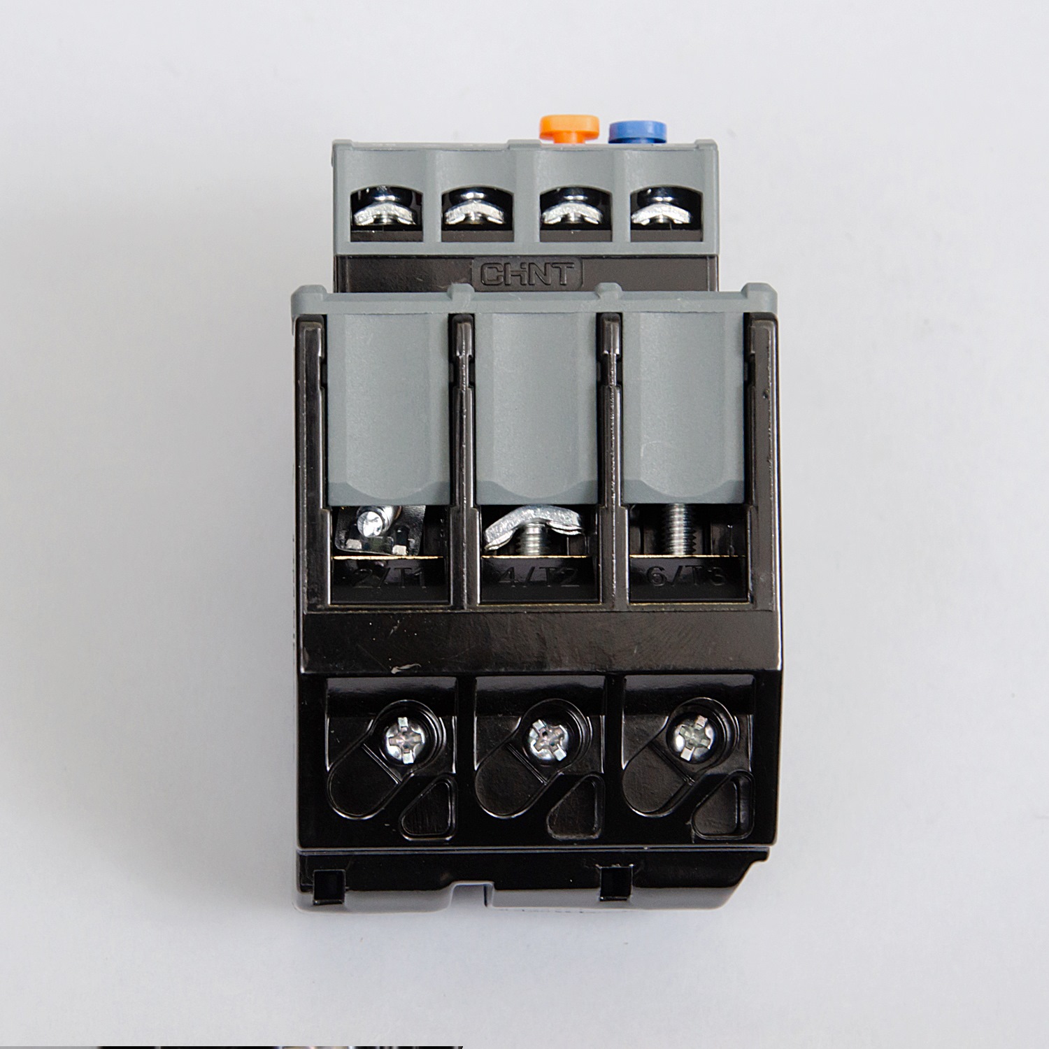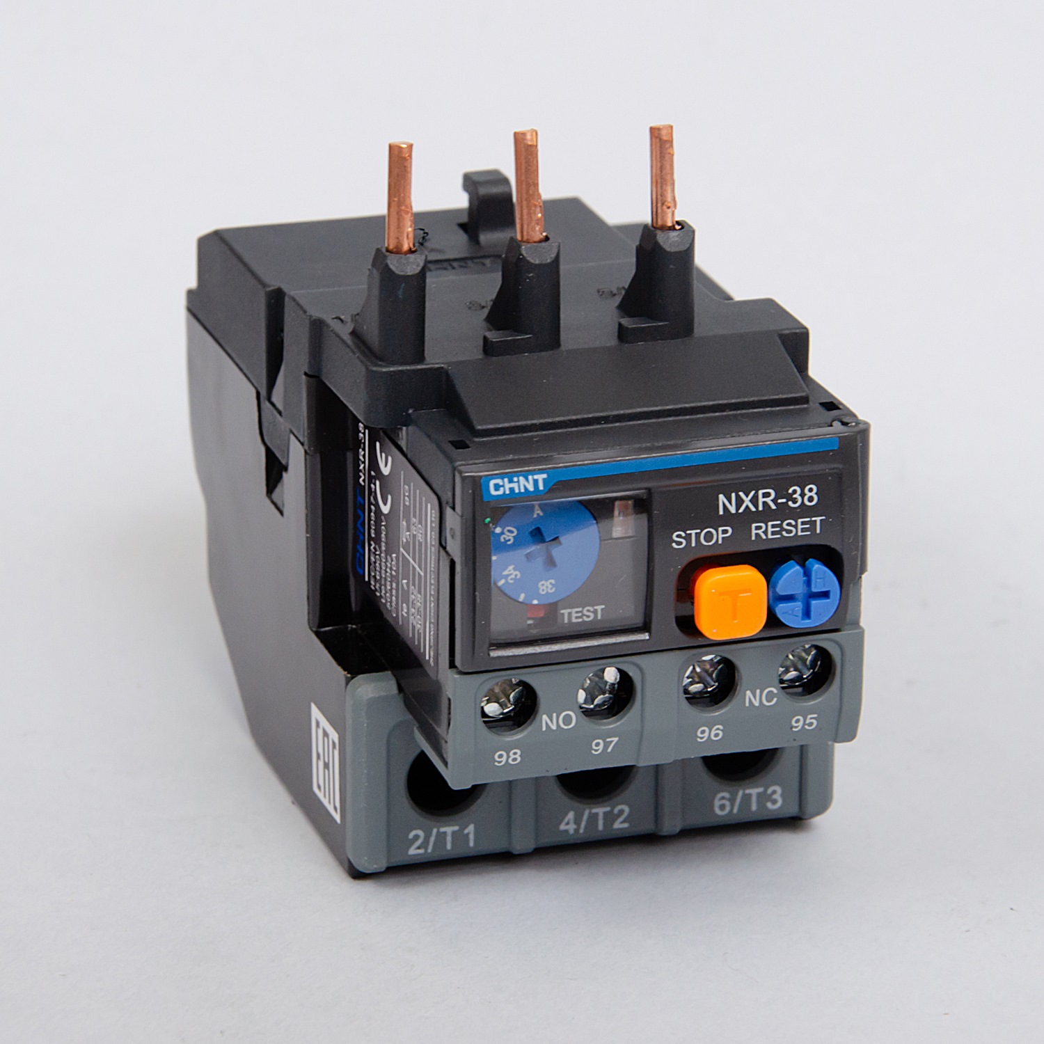 Next NXR — серия тепловых реле Chint для защиты двигателей переменного тока от перегрузки и обрыва фазы. Реле оснащены температурной компенсацией, кнопкой «тест» и работают в двух режимах: ручной сброс аварии и автоматический сброс с задержкой срабатывания. Исключение - модели NXR-200 и NXR-630, они оснащены только ручным сбросом. Модель NXR-38 может быть установлена только на универсальные контакторы моделей NXC-25, 32, 38 и выпускается с номинальным током от 23 до 38А. Тепловые реле не защищают от короткого замыкания, использование автоматического выключатели или предохранителя остаётся обязательным. Для реле 38А рекомендуется использование предохранителя 80А с кривой gG.