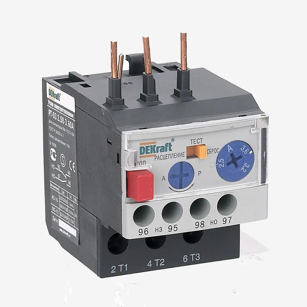 Тепловые реле РТ-03 DEKraft предназначены для защиты электродвигателей от перегрузки, превышения времени запуска, асимметрии фаз, заклинивания ротора.