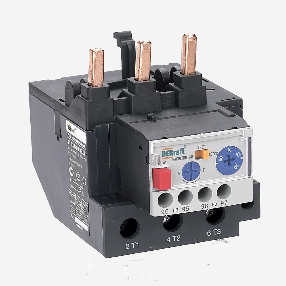 Тепловые реле РТ-03 DEKraft предназначены для защиты электродвигателей от перегрузки, превышения времени запуска, асимметрии фаз, заклинивания ротора.